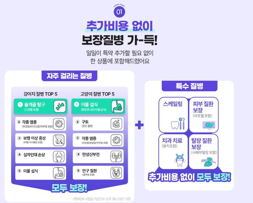 또 하나 인상적인 점은, 슬개골 탈구, 피부병, 치주질환 같은 반려동물에게 흔히 발생하는 질병도 기본 보장 플랜에 포함된다는 것입니다. 특약을 추가로 들지 않아도 어느 정도 대비할 수 있어, 추가 비용 걱정을 줄일 수 있습니다.
